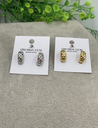 R$29,00R$19,00Material: Semijoia, Resina Esmaltada Cores, Zircônias Transparentes, Fecho Clique Tamanho: 2,5 cm (Diâmetro) Peso: 6.4 g (Par) -