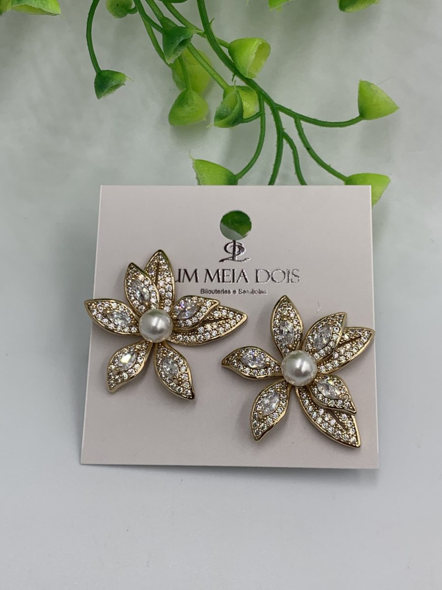 Brinco Flor e Folhas Sobrepostas com Miolo em Pérola
