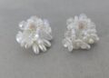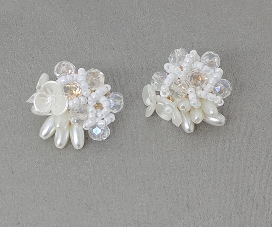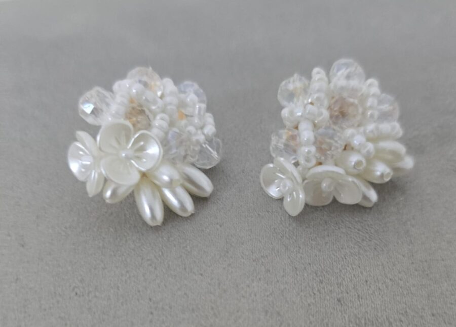 Material: Bijoux, Grãos de Pérolas, Resina Acrílica em Flores, Cristais Transparentes Tamanhos, Mini Miçangas Brancas, Base de Metal Banhado e Peças Fixadas em Fio de Nylon, Tarracha Sutiã de Orelha